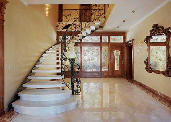 - Лестница в просторный холл должна подчеркивать габариты помещения. Следует обратить внимание на широкие прямые лестницы из дорогих материалов (для классических интерьеров) или легкие современные конструкции на больцах (для апартаментов в современном стиле).