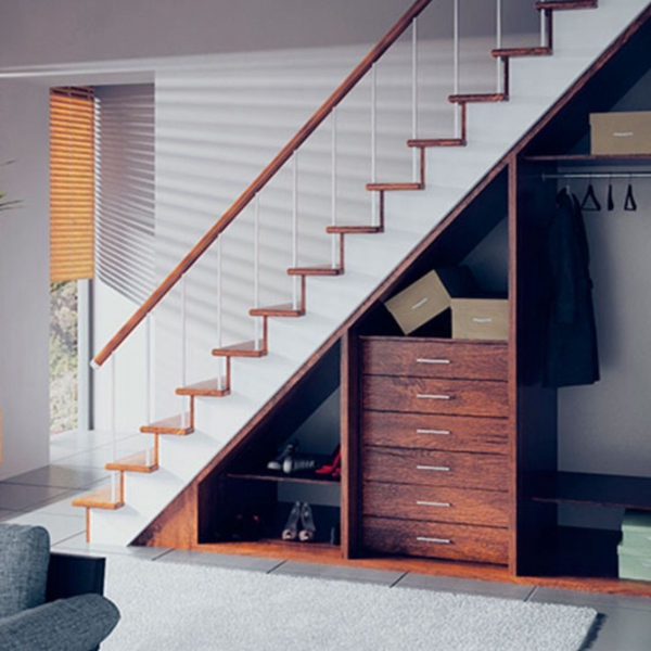 Стоит отметить, что для ходьбы лучше выбрать изготовление маршевых лестниц без поворотов, на них можно без проблем разойтись двух людям, удобнее переносить тяжести между этажами и намного проще мыть. Они занимают больше места – это верно, но его можно эргономично использовать и зашить пространство гипсокартонном или ОСБ, сделав полезные полочки или ниши под одежду (сделать гардеробную) или предметы интерьера.