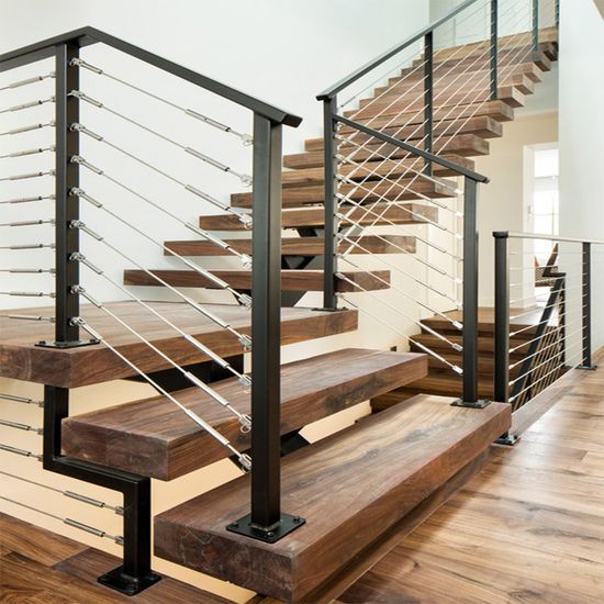 Пример оригинального дизайна: металлическая лестница на больцах в современном стиле с деревянными ступенями и перилами из тросов