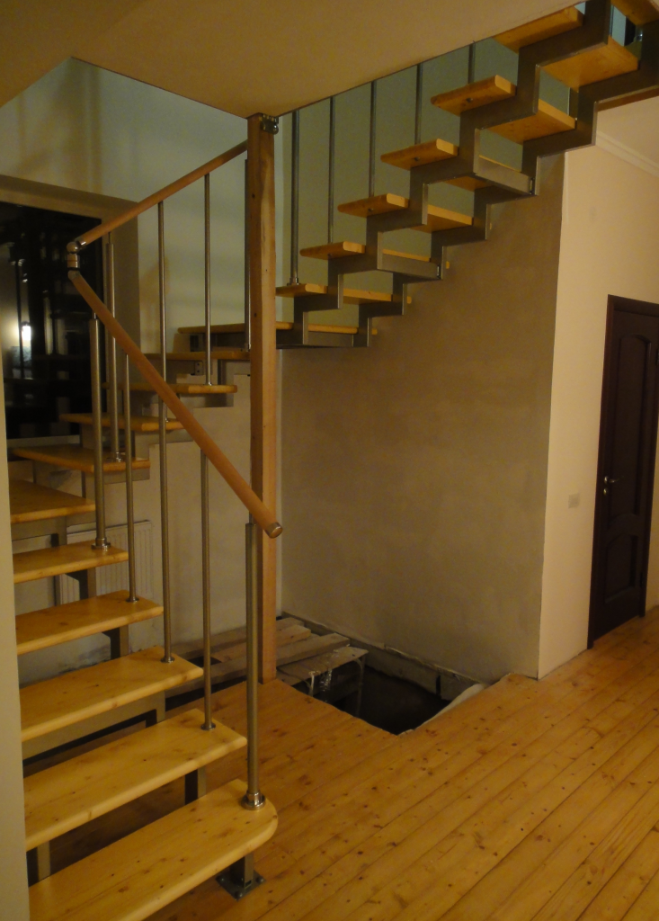 Второй вариант выбирают при дефиците места, и обычно такие ступени делают без проступей, что придает лестнице воздушность.