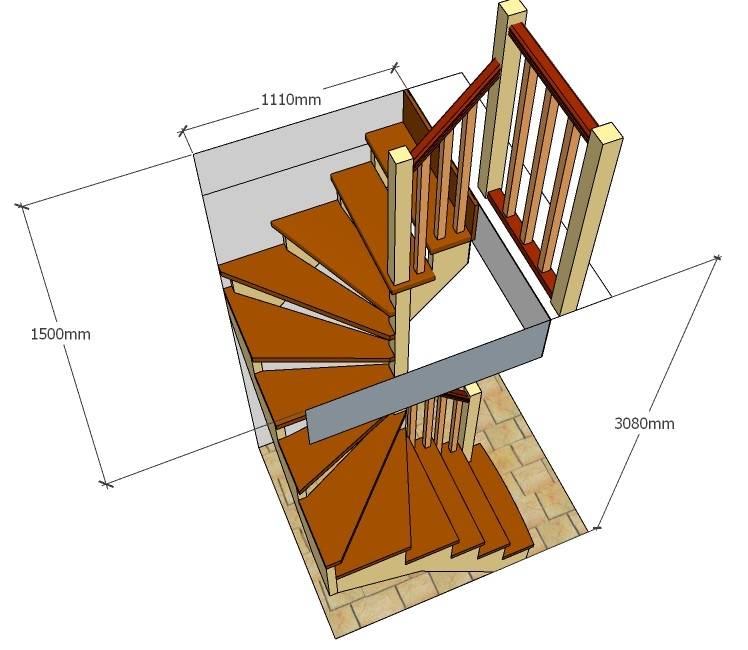 - Прямоугольная горизонталь разбивается на винтовые треугольные или трапециевидные ступеньки. Внутренней стороной они крепятся к центральной стойке.