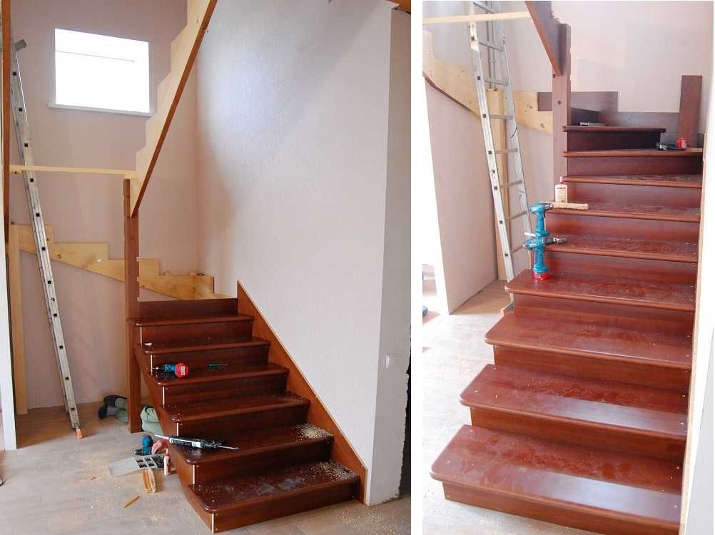 - Вариант 3. Установить новые ступени и подступенки поверх существующих ступеней и подступенков (что-то вроде сантехники для лестниц) — требуется отрезать выступ на ступенях под ними.