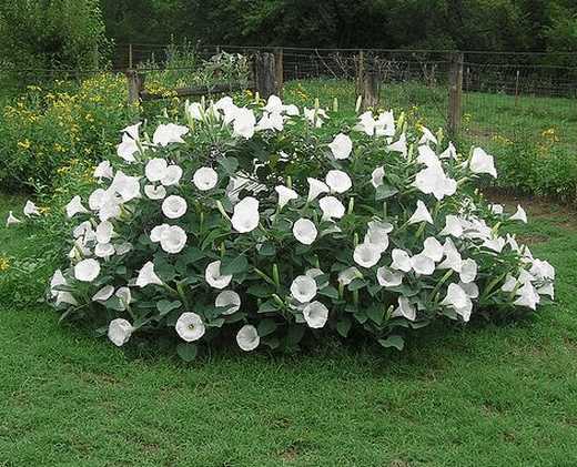 Датура- растение с крупными соцветиями сможет поистине украсить ваш сад красивыми белыми цветами, которые напоминают форму колокольчика. Также бывают синие, красные и желтые сорта. Датура быстро развивается и отличается от других однолетников долгим и обильным цветением. Датура-это высокорослый цветок (от метра и выше).