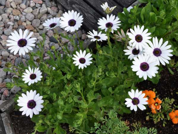 Бутонный диморфотекии внешне очень простые. Но именно в этом и скрывается их красота. Цветки по своей форме напоминают ромашку. Высота стебля составляет приблизительно 30 см. Цветовая палитра диморфотекии очень разнообразна — оранжевые, фиолетовые, розовые, белые. Лепестки имеют двойную окраску. Этот однолетник очень долго цветет, неприхотлив. Не боится разных болезней и вредителей.