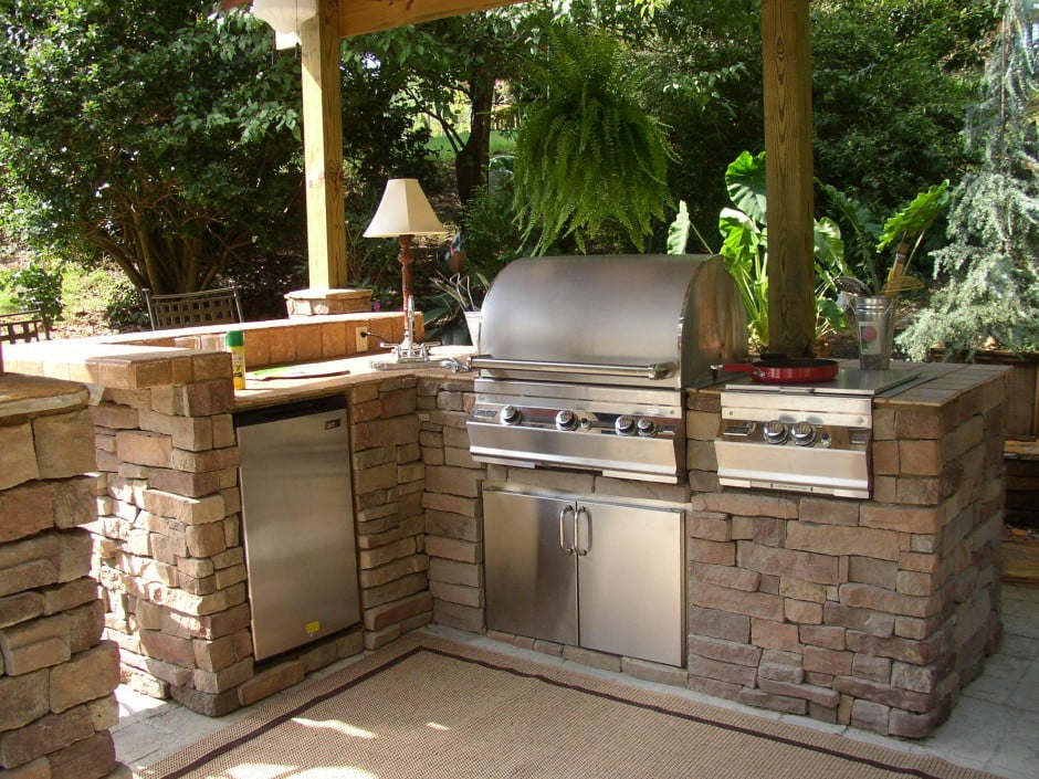 Одна из стен может примыкать к дому или другой постройке, позволяя вам сэкономить на материалах. Две каменные стены дают возможность обустроить угловую кухню, удобную с точки зрения эргономики и размещения столовой.