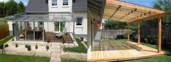 - Пристройка. Одна сторона в нём закрыта стеной дачного дома, а три другие — полностью открыты. Конструкции подобного типа очень популярны. Если они пристроены к входной двери, то выполняют роль террасы, а к задней части дома — неплохого патио.