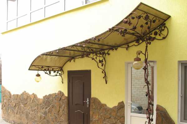 Для украшения навеса часто используют художественную ковку. Правда, ее в большинстве случаев можно встретить у входа солидных городских зданий – ресторанов, магазинов, но кто сказал, что художественной ковкой нельзя украсить навес на даче, если она подходит к стилю дома?