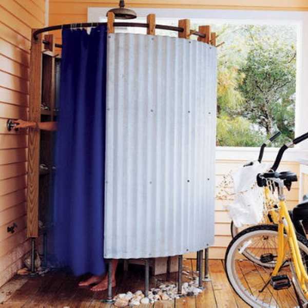 - Кабинка, защищающая человека от постороннего взгляда и предотвращающая разбрызгивание мыльной воды по периметру душа. В плане самостоятельного изготовления ее можно назвать будкой, изготовленной или из древесины, или из металла и ткани (как вариант, из пленки).