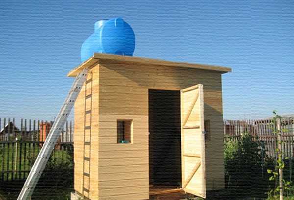 Емкость, в которой будет вода, устанавливается над кабиной. Для экономии это может быть стандартная до 200 л объемом бочка. Можно приобрести также б/у бак. Перед установкой бака монтируется отвод, а также устанавливается кран с распыляющей воду насадкой. Для заливания воды в бак применяется насос либо бак подключают к водопроводу.