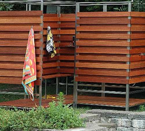 - Душевая кабина. Элементарно она изготавливается из четырех труб или брусков, установленных квадратом со стороной, равной одному метру. В самом верху такой опорной конструкции трубы соединяются друг с другом горизонтальными перемычками, на которые укладывается пара балок (те же трубы или бруски), которые служат опорой для установки емкости. Чтобы защититься от постороннего глаза и предотвратить разбрызгивание воды, с трех сторон такая конструкция затягивается непрозрачным полиэтиленом. Если говорить о капитальном подобном строении, то она обивается красивой строганной доской или рейкой. В принципе, это и вся летняя душевая кабинка, от которой, по большому счету, и вообще можно отказаться – в случае, когда дача большая и огорожена забором. Зачастую в таких ситуациях делается просто небольшая дощатая стеночка, которая скроет моющегося человека от родственников или просто гостей.