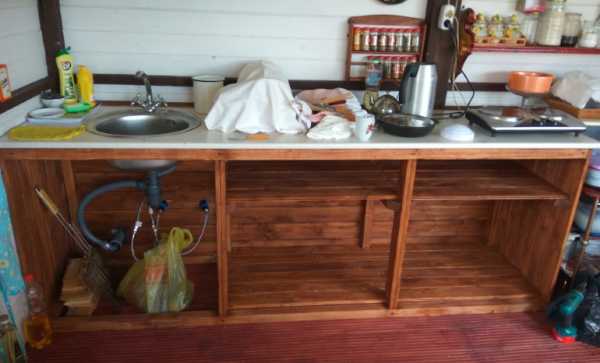 Открытая кухня может быть построена в виде веранды или беседки. Ее основные элементы — кухонная мебель (стол, лавки, стулья), мойка и плита для приготовления пищи.
