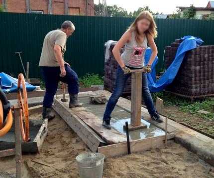 Устройство и монтаж фундамента для беседкиНа дне площадки укладывается песчано-гравийная подушка, которая тщательно утрамбовывается. Поверх увлажненной подушки заливается бетонный раствор.