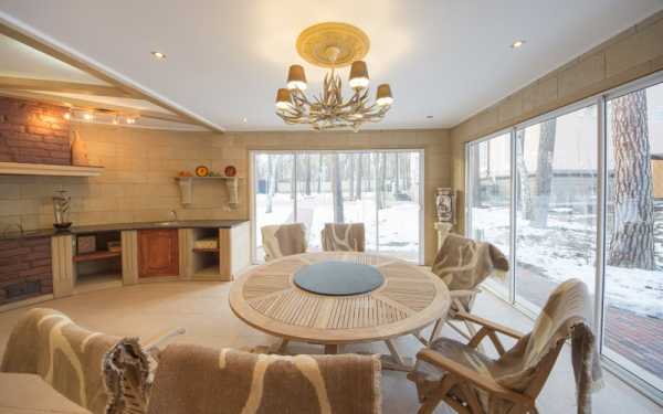 Чтобы сделать кухню-веранду более светлой и наполненной воздухом, можно смонтировать большие распашные окна или остеклить всю переднюю или боковые части.