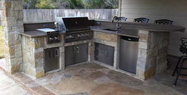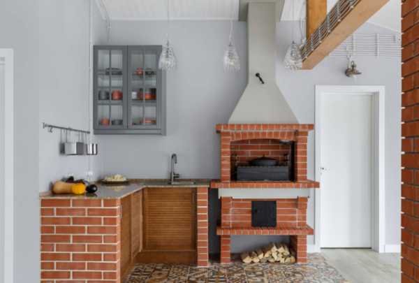 Одна из стен может примыкать к дому или другой постройке, позволяя вам сэкономить на материалах. Две каменные стены дают возможность обустроить угловую кухню, удобную с точки зрения эргономики и размещения столовой.