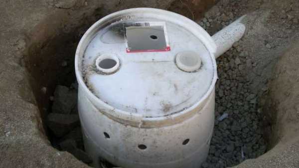 В дне и стенках бочки сверлятся отверстия, чтобы получилось решето, а под ней и вокруг нее засыпается щебень.
