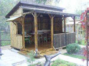 Если у вас не хватает финансовых возможностей для того, чтобы построить рядом с домом кухню из кирпича своими руками, то вы можете применить дерево, которое является более доступным материалом. Однако для того чтобы конструкция из этого материала прослужила долго, необходимо провести обработку натурального материала, используя специальные составы.