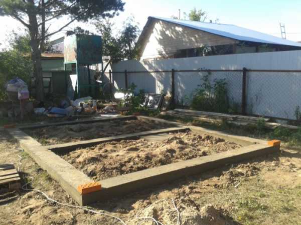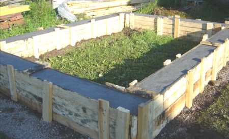 Чтобы залить ленточный фундамент, нужно выкопать траншею глубиной 30-50 см по периметру будущего здания. В траншею устанавливают опалубку из досок, на дно насыпают слой гравия или песка толщиной 10 см. Затем в опалубку укладывают прутья арматуры, после этого заливают бетон. Бетон застывает в течение 2-4 недель, раньше этого срока продолжать строительство нельзя, так как фундамент еще недостаточно прочен.