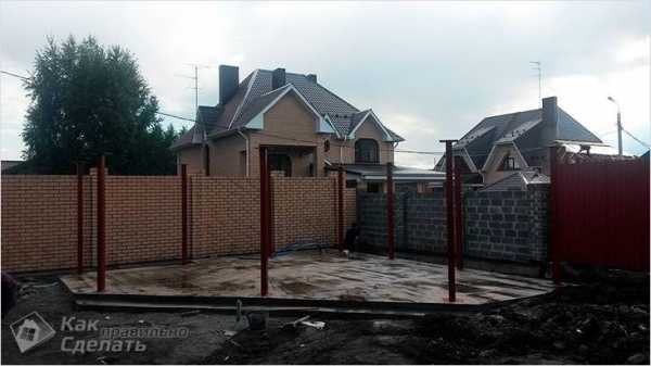 Для столбчатого фундамента копают ямы глубиной 50 см под каждый столбик, на дно насыпают песок хорошо утрамбовывают. Ширина ямы зависит от толщины столбиков. Для кухни обычно достаточно таких столбов, как на фото. В середину ямы вставляют прут арматуры.