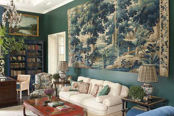 Дизайнеру предложили обновить фамильный особняк, в котором на данный момент живет уже третье поколение одной семьи. Нужно было сделать дом современным, при этом не перечеркивая его истории, полной дорогих для хозяев воспоминаний. Наследство, доставшееся декоратору, — отличная, собранная за много лет коллекция европейской мебели, украшавшая этот дом все эти годы. В какой-то мере она отображала не только историю семьи, но и самого места, где стоит особняк, — Таксидо-парк, это фешенебельный курорт в горах штата Нью-Йорк. Работу дизайнер начал с гостиной – она казалось меньше из-за не очень удачной расстановки мебели. Недолго думая, дизайнер отпилил у каждого из двух стоящих здесь диванов по подлокотнику и сделал из них один большой. Комната сразу стала просторнее. Одна из гостиных превратилась в зал для игры в бридж, который хозяева просто обожают. Вдоль длинного дивана дизайнер расставил столики с легкомысленными зонтиками. Билхьюбер убрал со стен громоздкую лепнину и расписал их разноцветными полосками. Дизайнер сделал холл светлее, выкрасив коричневые деревянные панели бирюзовой краской, а хрустальную люстру в столовой дополнил красными абажурами. Во всех комнатах появились акценты пурпурного, оранжевого, фуксии, визуально объединяющие интерьер.