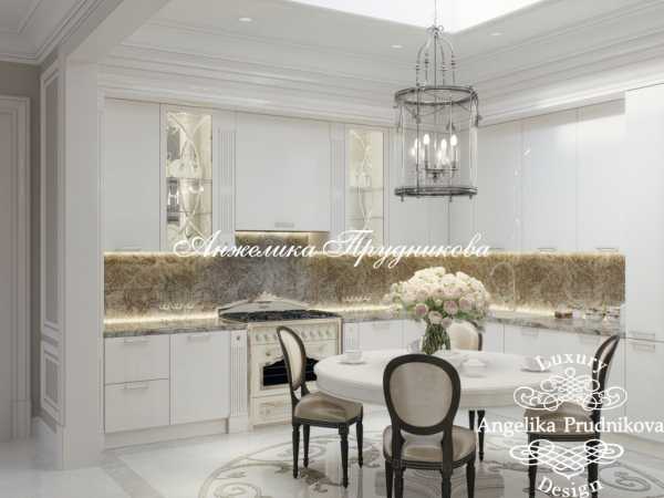 На фото: Дизайн интерьера кухни в стиле неоклассикаИнтерьер этой кухни в неоклассическом стиле порадовал владельцев компактностью и миниатюрной столовой в центре, прямо над роскошным узорным панно из натурального мрамора в дизайне пола!