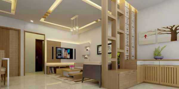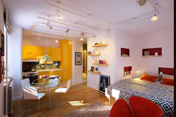 Часто используются ниши и перегородки, разделяющие пространство на функциональные зоны, подсветка.