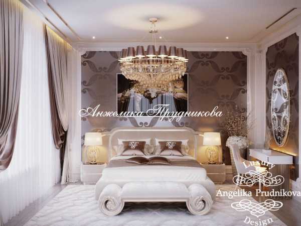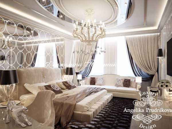 Ар-деко в интерьере светлой спальни с высокими потолками