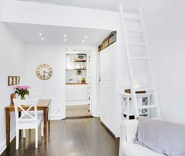 Именно здесь удалось разместить спальное пространство, кухню и даже гардероб. Все системы хранения продуманы и расположены таким образом, что, несмотря на маленькие габариты, получился светлый современный интерьер квартиры без лишних нагромождений.
