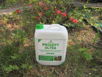 6) Просепт Ультра. Данная пропитка является невымываемой. Обеспечивает надежную и длительную защиту деревянным конструкциям, находящимся в крайне тяжелых условиях. Им не будут страшны грибки, плесени, насекомые и гниль в течение 30 лет.