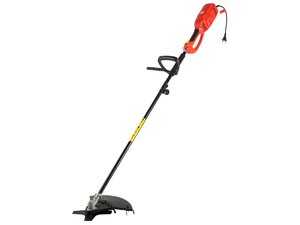 Электрический триммер (950 Вт) подойдет для скашивания мягких и жестких упругих стеблей. Режущий инструмент – леска 2-2,4 мм толщиной или нож диаметром 23 см. Режущий нож обоюдоострый (можно перевернуть другой стороной), не подлежит заточке. Ручка – J-образная, дополнительная рукоятка устанавливается на нужную высоту в зависимости от роста оператора. Довольно значительный вес инструмента – 6,7 кг – делает его неженским вариантом. Режим работы, регламентированный паспортом – 15 мин кошения/ 10 мин перерыв. Допустимая длина удлинителя – 100 м (при сечении провода 4 мм). Гарантия 1 год. Страна бренда – США. Производитель – Китай. Основные плюсы: