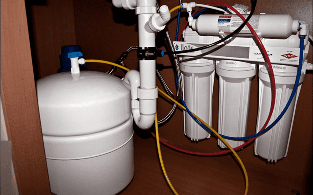 - Устанавливаются под мойку и служат для доочистки водопроводной воды. У них может быть от трех до пяти картриджей. Вода из трубопровода проходит через них , прежде чем попасть в отдельный кран. Он входит в комплектацию фильтра и его необходимо установить на мойке.