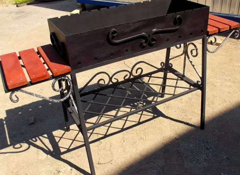 Снаружи изделие отделывают коваными элементами или обкладывают камнем. Установив конструкцию под крышей или изготовив навес, можно готовить шашлык в любую погоду. - Переносные мангалы изготавливают из тонкостенного металла. Это существенно облегчает изделие, но уменьшает срок эксплуатации мангала. Благодаря маленькому размеру и весу, металлический мангал часто берут в поход. Обычно для компактности его делают складной конструкции, в виде маленького чемоданчика.