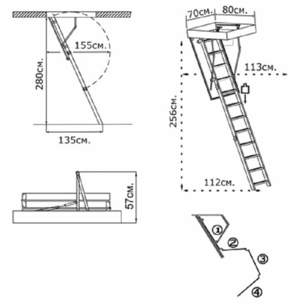 Этапы раскладывания конструкцииВ сложенном состоянии, при открывании люка, выдвигается небольшая складная лесенка для доступа на чердак. Размеры ее позволяют без проблем спрятать конструкцию под люком. Сам люк зачастую утепляется со стороны чердака и закрывается очень плотно. Это исключает сквозняки даже в самое холодное время года при максимальной разнице между температур в помещении и на чердаке. А значит, вы без опаски можете опускать лестницу даже в лютый мороз.