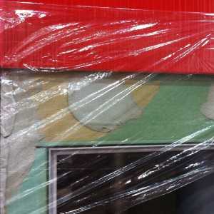 Откройте люк и подложите под его дверцу пленку. Закройте дверцу. Пленка должна покрыть всю поверхность стены, кроме дверцы. Выкрутите временные шурупы-саморезы с лицевой стороны дверцы.
