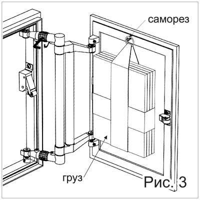 Внимание! Во избежание провисания дверцы, при монтаже средних и больших люков, используя подручные средства, закрепить на специальном крючке (или на ввинченном в рамку дверцы саморезе) на внутренней стороне дверцы груз, в 1,5-2 раза превышающий вес наклеиваемой плитки.