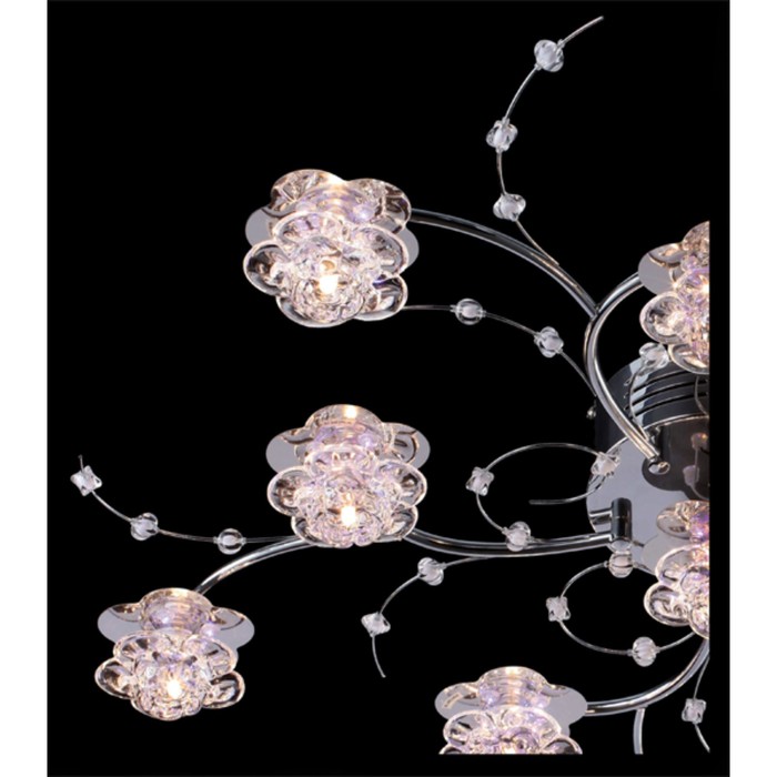 Современная люстра с зеркальной потолочной пластиной украшена овальным декором из прозрачного и матового стекла, а также подвесными хрустальными пуговицами и изящными цепочками. Этот современный светильник имеет дистанционное управление для удобства и стиля, а шесть ламп дополняются 36 энергосберегающими светодиодами, излучающими потрясающий сине-белый свет.