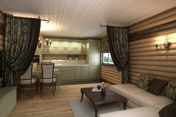 Кухню от столовой зоны отделяют барной стойкой или широкой столешницей. В центре комнаты ставят камин, который украшает дизайн интерьера.