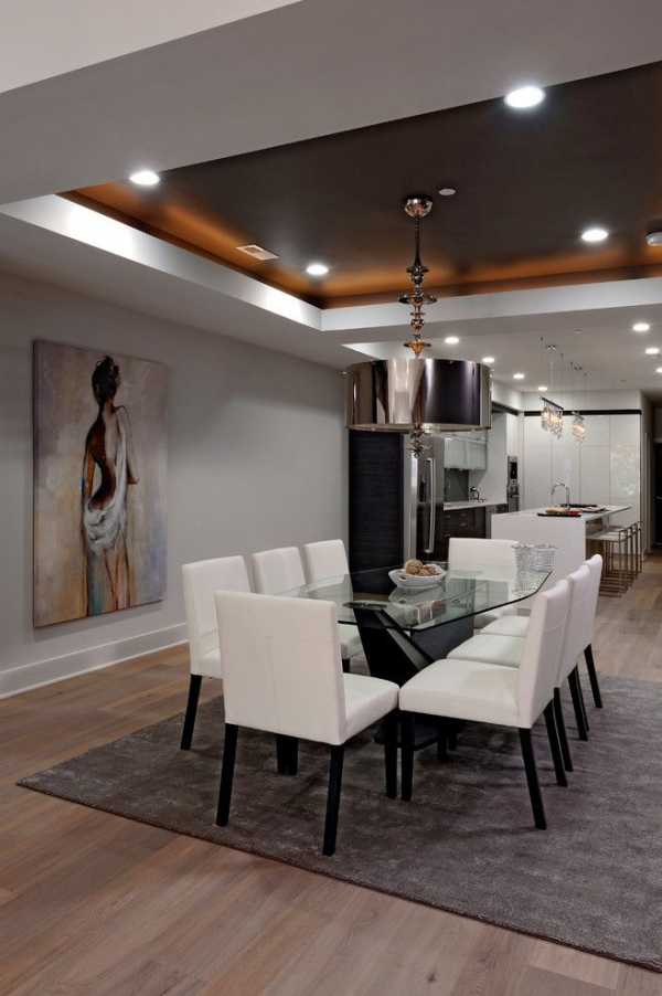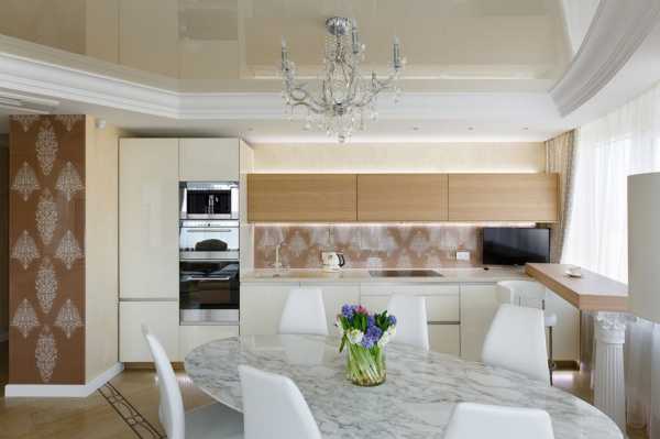 - Лучше всего выбирать люстры для натяжного потолка в зал с направленным светом на стол: фото подтверждает, что это самое оптимальное решения для гостиной.