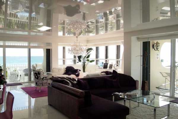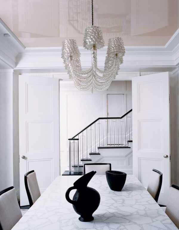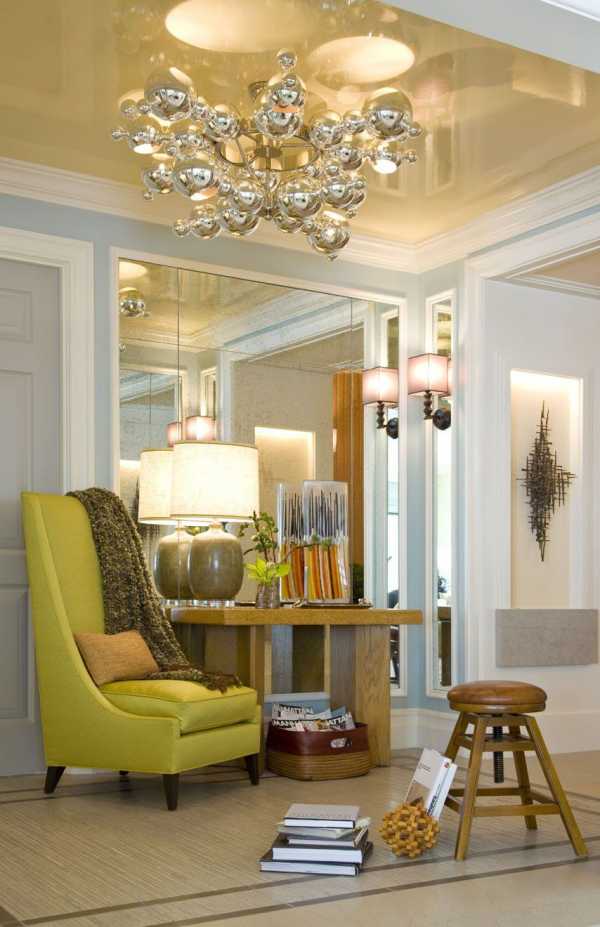 - Если потолок глянцевый, он будет показывать отличные зеркальные свойства: на его поверхности будет отображаться внутреннее устройство люстры. Поэтому отдавайте предпочтение моделям, которые имеют незаметную внутреннюю проводку.