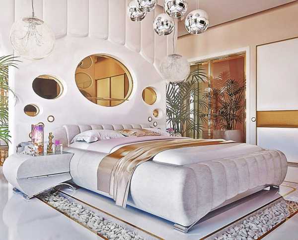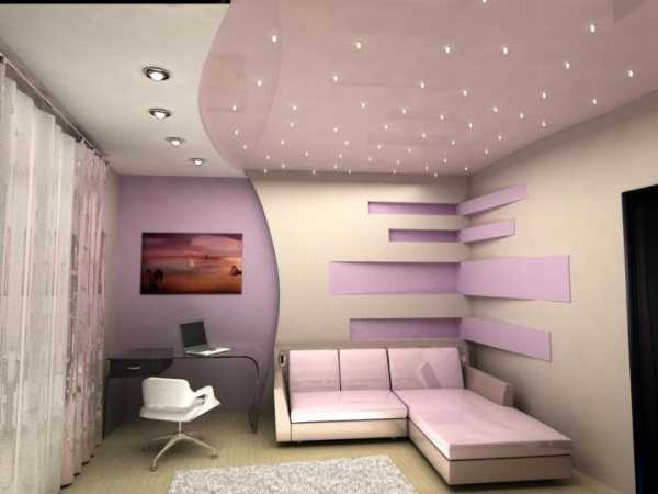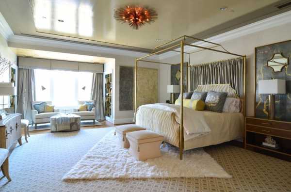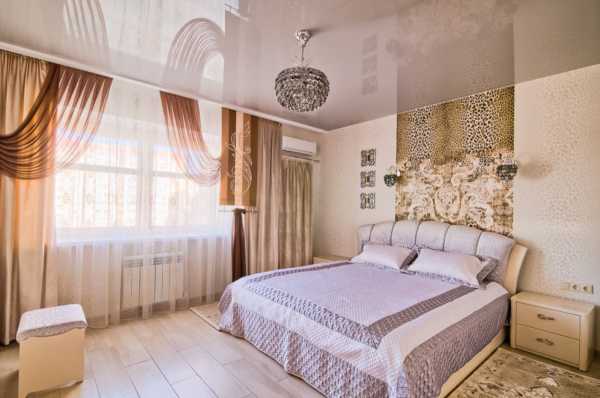 Популярен для спальни потолок с эффектом «звездного неба». Это зрелищно, поскольку спальня будет выглядеть просто шикарно! Организация света предполагает прокладывание в спальне оптических волокон. Специальные светофильтры позволяют обеспечить мерцание и переливы света. Еще один необычный способ оформления света в спальне – это скрытый свет, который предполагает монтаж ламп дневного света за карнизы или выступы стен. В итоге получается, что потолок как будто не связан со стеной и навис в воздухе.