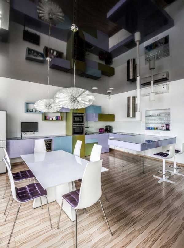 Невероятно красиво смотрятся люстры с подвесками из цветного или граненого стекла. Такой вариант великолепно сочетается с глянцевым натяжным потолком. Интересная игра цветов и рисунков наполнит атмосферу волшебством.