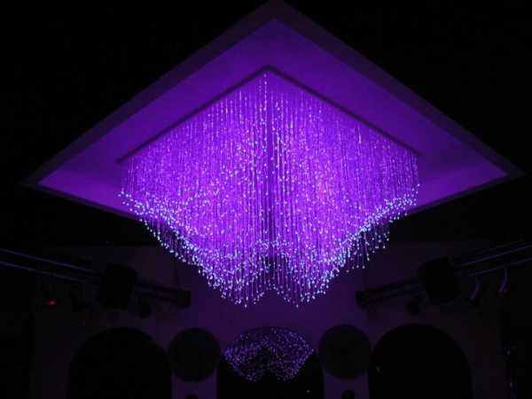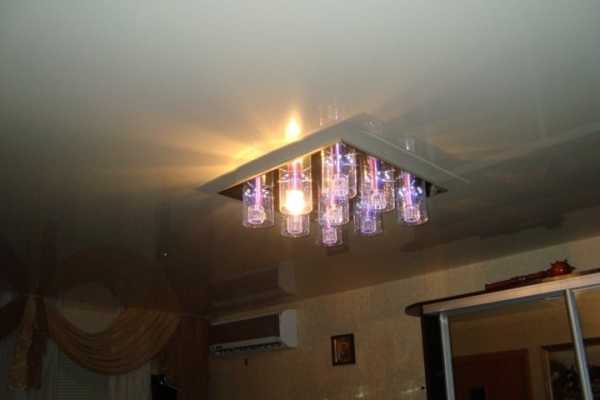 Так как большинство натяжных потолков – глянцевые, и на них хорошо виден отражающийся узор света, то при выборе люстры необходимо учесть возможность рассеивания бликов света по потолку. Если вы выбираете люстры с плафонами, следует отдать предпочтение ажурным плафонам с отверстиями, через которые свет будет оригинально рассеиваться по потолку. Плафоны должны находиться на расстоянии, не меньше 20-25 см от потолка и иметь лампочки либо галогенные, мощностью до 35 Вт, либо лампы накаливания до 40 Вт.