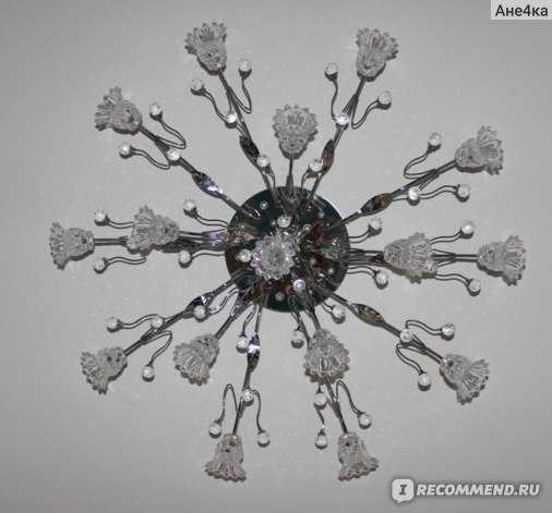 Очень изящная люстра, вписалась в наш интерьер. Комната выглядит с ней совсем по другому, нарядно, празднично. Знакомые заходят, восхищаются. Свет не яркий, но очень комфортный для глаз