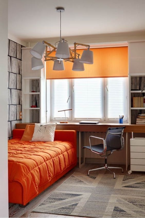 Сочетание синего и оранжевого придает комнате теплый и уютный вид