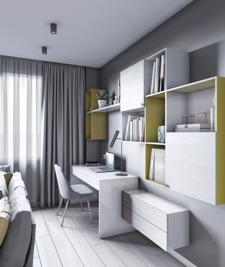 Добавьте несколько полок и множество настенных украшений. Поставьте небольшой стул рядом с кроватью и создайте приятную рабочую или учебную атмосферу.