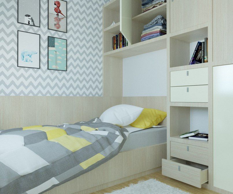 Добавьте несколько полок и дополнительное место в ящиках под кроватью. Расширьте пространство с помощью белых или бежевых стен.