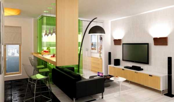 Цветовая гамма в дизайне маленькой квартиры-студии должна быть лаконичной и простой- Дизайн маленькой кухни в квартире-студии необходимо тщательно обдумать – над плитой нужно установить мощную вытяжку (испарения от готовки могут разлететься по всей квартире), вместо сломанной межкомнатной перегородки — барную стойку (фото вариантов множество). Столешница зрительно отделит кухню от основной части помещения, но не будет мешать общению с гостями и уменьшать площадь комнаты.