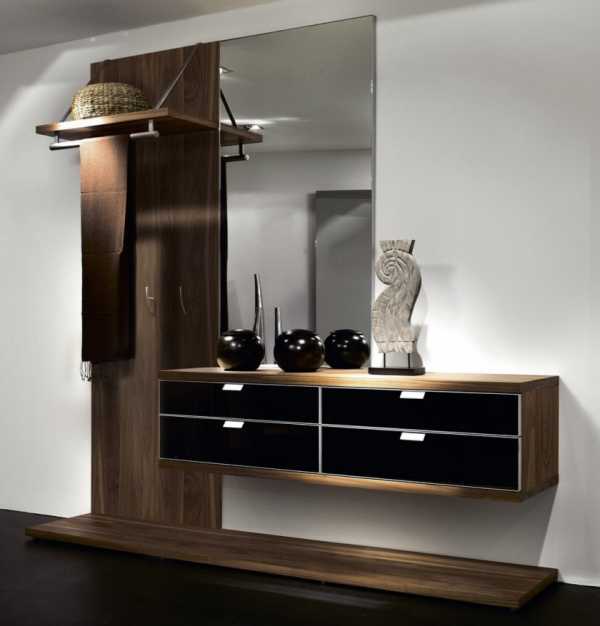 - мебель для хранения мелких предметов — она обычно оснащается зеркалом, а внизу имеются выдвижные ящики или полки. Данный элемент непременно имеется в любой прихожей, так как без него невозможно будет расположить по разным местам расчески или иные мелкие предметы;