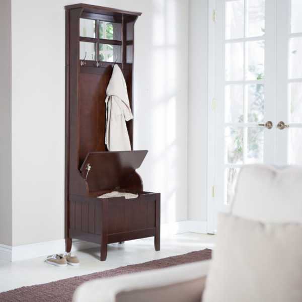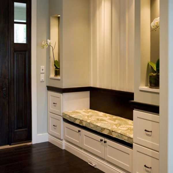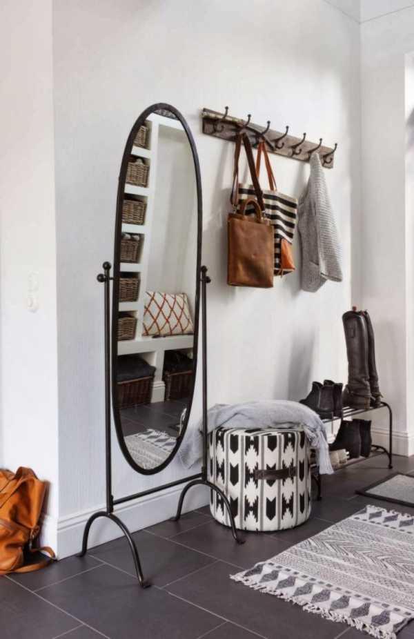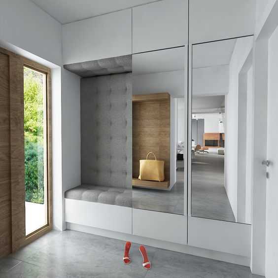 При входе можно разместить вешалку с небольшой скамьей, для удобства и шкаф для хранения обуви. Также не стоит забывать о присутствии зеркала. Которое играет немаловажную функциональную роль.