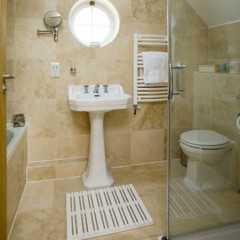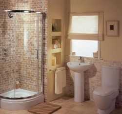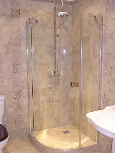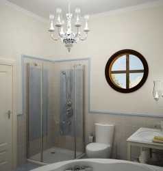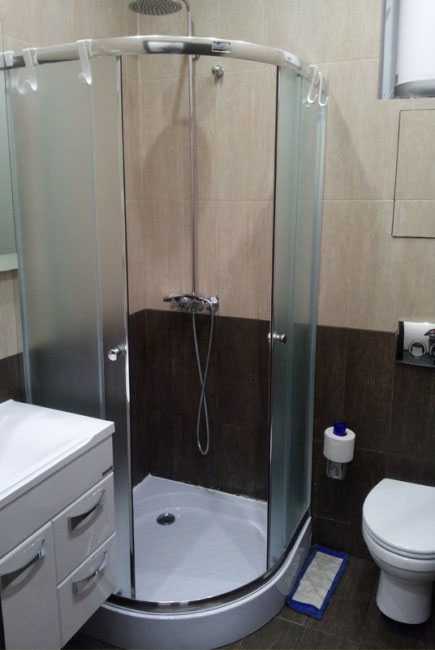 - Если помещение слишком маленькое и имеет прямоугольную форму, то нужно следовать другим правилам. В таком случае лучше использовать полукруглую кабинку, размещая ее в углу той стены, на которой находится дверь, учитывая, что проем располагается в центре стены.