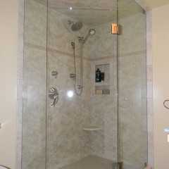 - Если дверь в ванной комнате «сдвинута» от центра в сторону, то душевые гармоничнее всего будут смотреться в дальних углах или вдоль дальней стены.
